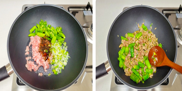 8. 웍에 기름을 두르고 다진돼지고기,청양고추,꽈리고추,가지덮밥소스를 넣고 볶아줍니다. 생다진대파1/3은 남겨놓고 다진대파2/3만 넣고 볶아줍니다. 다진돼지고기가 어느정도 익도록 볶아줍니다.