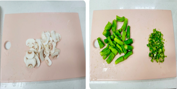 2. 양송이버섯3개를 얇게 채썰어 줍니다. 청양고추2개는 다져주며, 꽈리고추8개를 2~3cm크기로 잘라 줍니다.
