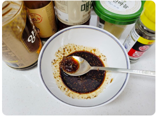 7. 이제 가지덥밥 소스를 만들어 봅니다. 간장4T, 굴소스1.5T, 매실청1T, 다진마늘0.5T, 후춧가루를 섞어줍니다.