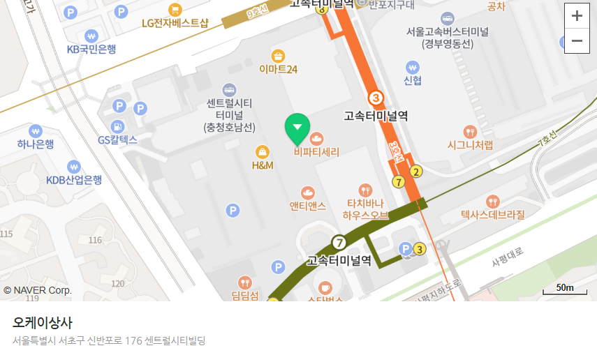 센트럴시티빌딩 1층에 위치해 있고, 강남 신세계 백화점 옆에 있는 6,7번 게이트 입구 바로 앞이라 찾기 쉽습니다.