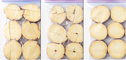 고구마는 잘라서 냉동합니다. 가열 처리하지 않고 그대로 냉동함으로써 변색이 잘되지 않고 냉동실에 약 1개월 저장 가능합니다.
