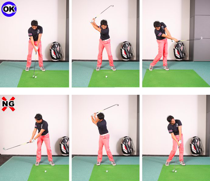만일 이 시점에서 확인해도 괜찮았는데 공이 크게 빗나간다면 테이크백 이후의 어딘가에서 페이스의 방향을 움직이는 동작은 없는지 체크해 보세요