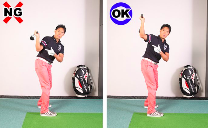 오른쪽 팔꿈치의 각도는 어드레스일 때 만큼 직각 정도로 하는 것이 좋습니다.