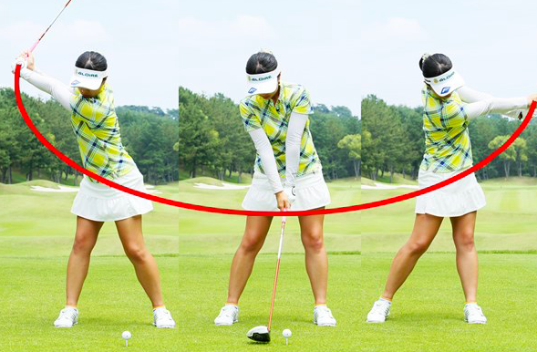 컴팩트한 탑을 만들기 위해 저는 왼팔을 의식하게 되는데요. 바로 왼팔을 늘린 채 스윙하는 것. 팔꿈치를 굽히지 않고 몸과 공과의 거리를 유지하면서 클럽을 올려갑니다.