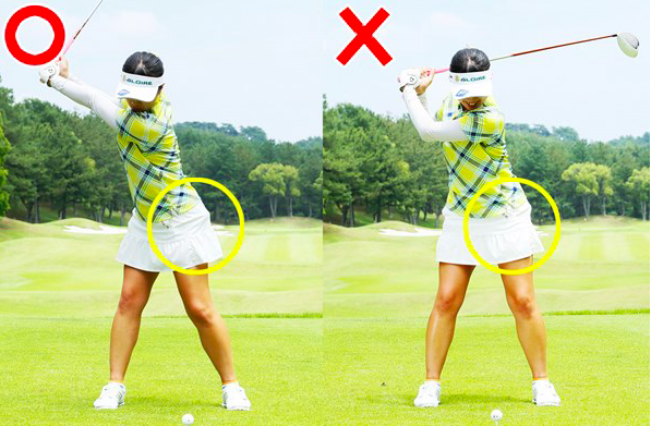정상 자리 탑에서도 왼팔은 쭉 뻗은 채.구부리거나 답답하게 느껴질 정도로 치켜올려 버리면 오버 스윙이 됩니다. 상체를 제대로 돌릴 수 있다면 멀리 날리기에 필요한 움직임은 충분히 갖추고 있다고 할 수 있습니다.