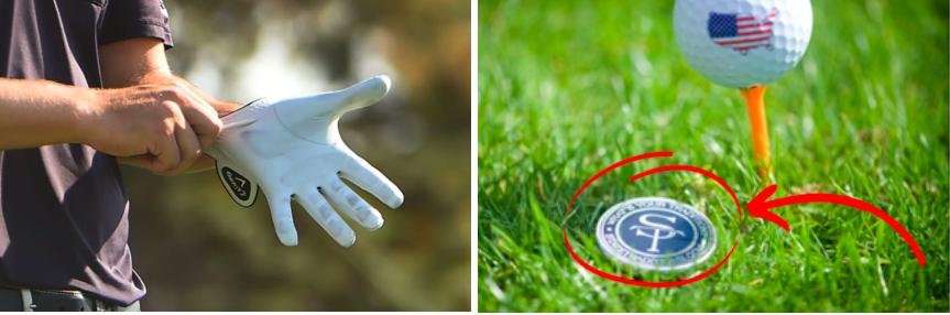 당연히 필요한 것이 또 골프장갑인데 초보자분들이나 여성분들은 양손에 같이 껴주시면 좋습니다. 골프장갑은 그립과의 일체성의 더해주고 스윙을 할 때 미끄러지거나 손안에서 헛도는 것을 방지해 줍니다. 볼 마커도 많이 챙기는 준비물 중 하나인데, 없어도 라운딩 불가능한 것은 아닙니다. 하지만 그린 위에서 퍼팅을 할 때 다른 사람과 퍼팅라인이 겹친다면 볼 마커로 공 자리를 표시한 후에 공을 집어야 원활한 진행이 가능합니다. TV에 나오는 시합 영상을 보면 볼 마커를 표시한 후 공을 집는 것을 많이 볼 수 있습니다.