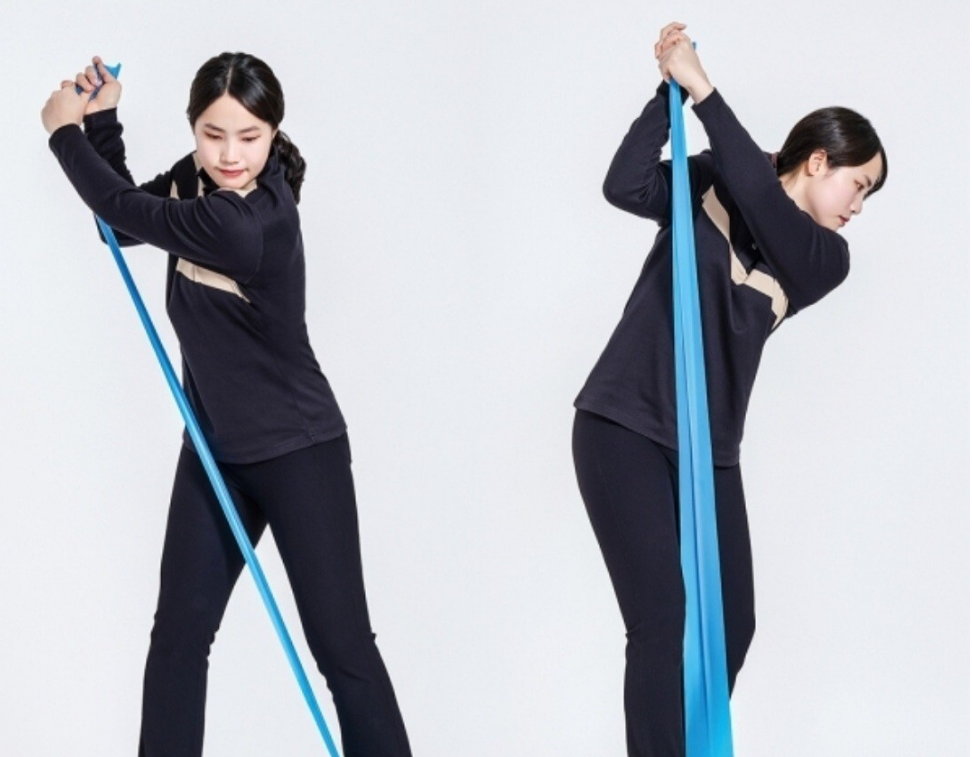 이렇게 백스윙을 하면, 왼쪽 어깨는 턱 밑에 위치해 있고, 오른쪽 가슴과 옆구리는 뒤쪽으로 늘어나게 되면서, 밴드를 잡고 있던 손의 위치는 귀 옆과 가슴 앞에 알맞게 정해진다. 이 방법으로 연습스윙을 20번 정도 두 세트 해주면, 알맞은 몸통 회전을 사용해서 회전하게 될 것입니다.