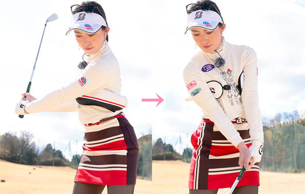 백스윙에서 오른쪽 겨드랑이가 열리면 톱에서 샤프트가 크로스되어 극단적인 인사이드 궤도가 되어 버립니다. 커버가 떨어지지 않도록 탑의 높이를 억제함으로써 반격 이후에 올바른 플레인 그대로 상체의 회전으로 흔드는 것으로 연결됩니다.