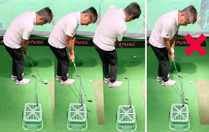 주의해야 할 포인트는 정상일 때 배꼽 바로 아래를 헤드 최하점으로 한다는 것입니다. 탑일 때 배꼽의 위치가 오른쪽으로 어긋나 버리면, 스웨이가 커지거나 헤드 궤도가 어퍼가 되기 쉬워지기 때문에 실수가 나오기 쉽습니다.
