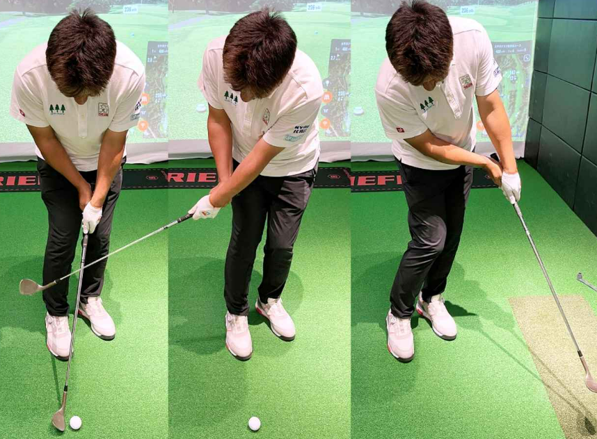 주의해야 할 포인트는 정상일 때 배꼽 바로 아래를 헤드 최하점으로 한다는 것입니다. 탑일 때 배꼽의 위치가 오른쪽으로 어긋나 버리면, 스웨이가 커지거나 헤드 궤도가 어퍼가 되기 쉬워지기 때문에 실수가 나오기 쉽습니다.