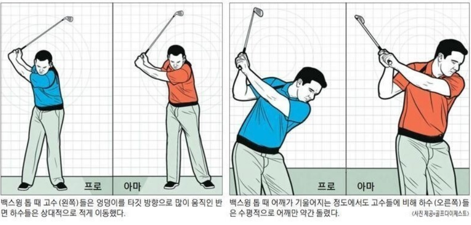 백스윙 톱 때 어깨가 기울어지는 정도에서도 차이를 보였습니다.