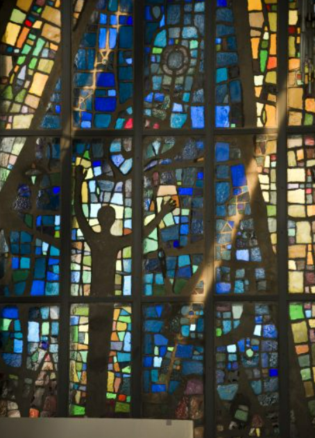 그리고 무엇보다도 눈앞에 보이는 이 모자이크 스테인드글라스가 가장 큰 매력입니다. 그것은 하나님의 손을 나타낸다고 하며, 그 주위에 넘쳐나는 좌우의 빛줄기는 여자와 남자를 통과하고 있으며, 하나는 예수 그리스도를 표현 했다고 합니다.