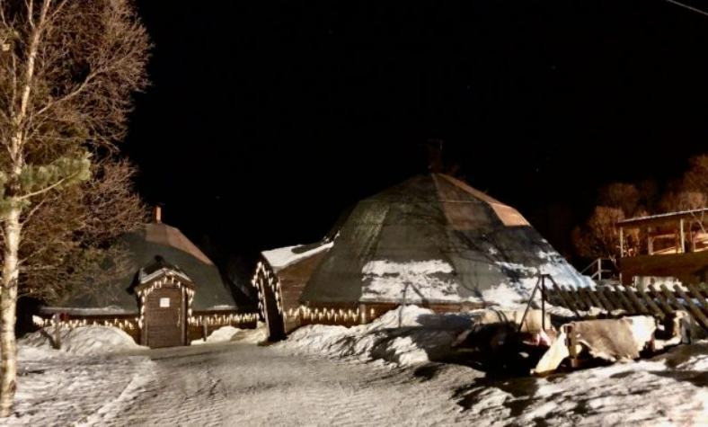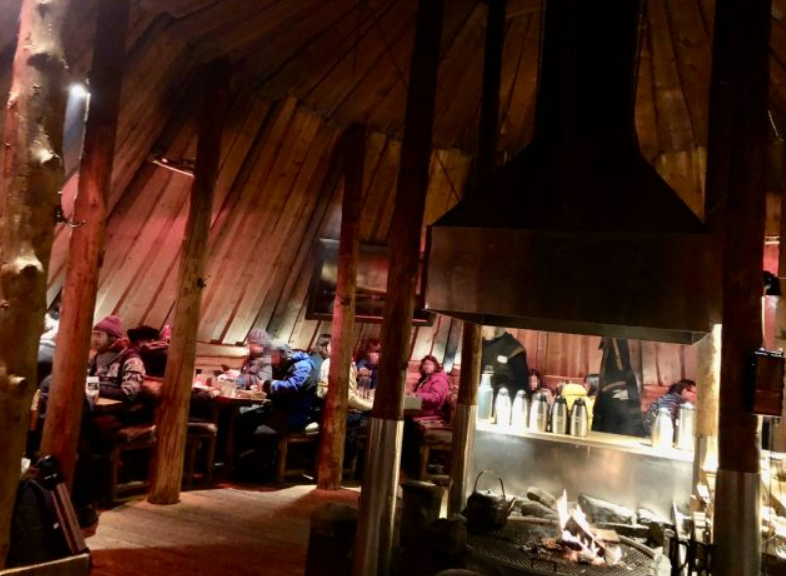 밖에서 즐거운 시간을 보낸 후에는 북극권의 사미 원주민의 텐트 스타일 오두막에서 저녁 식사를 할 시간입니다!