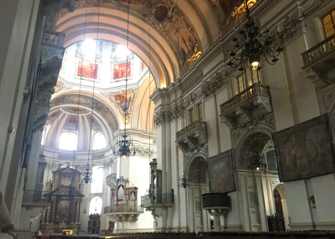 잘츠부르크 대성당은 774년에 창설되었으며 잘츠부르크의 역사적 건축물이기도 합니다. 프레스코화가 그려져 있어 모두 아름답고 깊이 있는 천장에서 눈을 뗄 수 없습니다.
