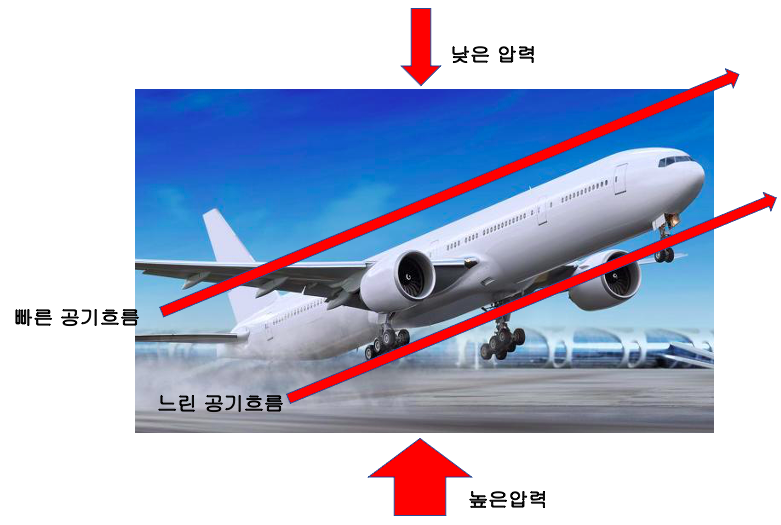 비행기의 날개는 이륙하기 위해 특수하게 제작 되어, 엔진을 통한 추진력이 생기면, 상기 사진과 같이 비행기 위에는 빠른 공기흐름이 생깁니다. 느린 공기흐름이면 압력이 높아지고, 빠른 공기 흐름이면 압력이 낮아지므로 비행기가 위로 뜨려고 하는 양력이 생깁니다.