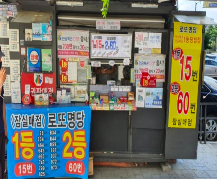잠실역 8번출구에 자리잡고 있는 로또명당 가판점인 잠실매점 입니다.