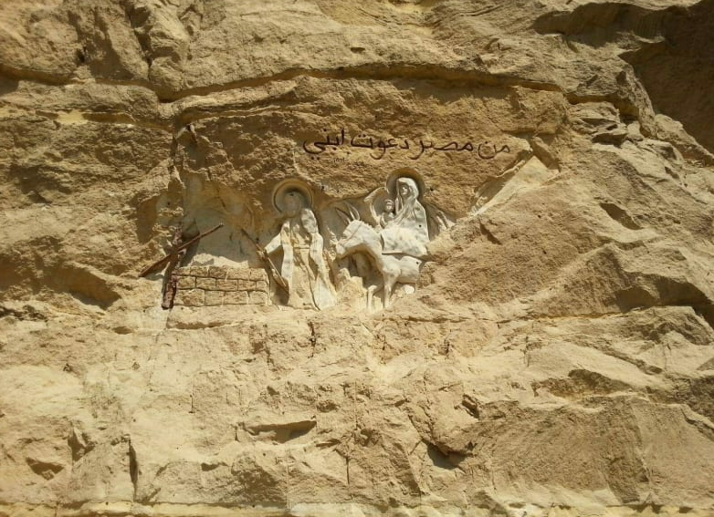 이 광장에서 벽을 올려다 보면 조각이 있습니다. 이것은 예수가 마리아의 팔에 안겨 애굽을 떠나는 것을 나타낸다고 합니다.
