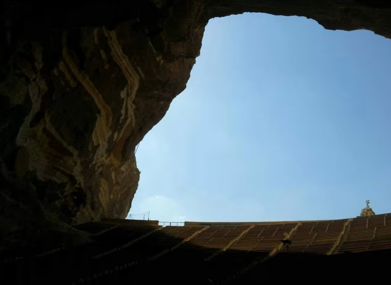 언덕 꼭대기에 도착했을 때 가장 먼저 보이는 것은이 예배당입니다. 로마의 원형 극장을 연상시키며, 무대를 향하고 있는 돌 의자가 줄지어 있습니다. 가장 놀라운 것은 바위 동굴이 꽤 크다는 것입니다!