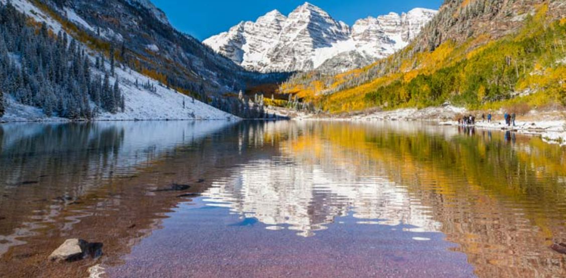 마룬 호수(Maroon Lake)와 마룬 벨(Maroon Bells)은 콜로라도 로키 산맥의 가장 상징적인 전망입니다. 여름에는 야생화가 만개하여 관광객들에게 인기가 있습니다. 아침이나 낮 등 시간대에 따라 호수에 비친 산은 다른 표정을 보여줍니다.