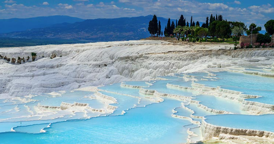 터키어로 "목화 성"을 의미하는 이곳은 터키 남서부 데니즐리에 있는 자연 유산입니다. 온천의 석회 성분이 퇴적된 석회질은 새하얀 눈이 쌓인 것 같은 환상적인 풍경을 보여줍니다. 하얀 라임 선반에 흐르는 푸른 물은 실제로 하늘의 파란색을 반사하는 온천입니다. 경치를 즐기는 것 외에도 온천에서 목욕을 할 수 있는 곳도 있으니 족욕을 즐겨 보는 것은 어떨까요?