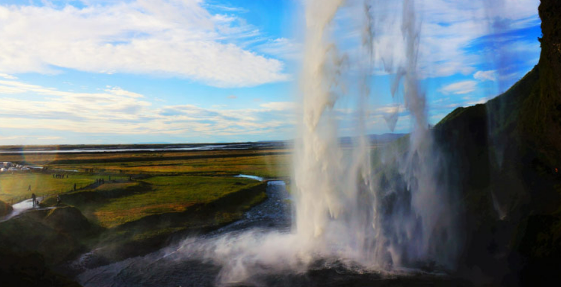 아이슬란드 남부에서 최대 낙차가 약 65m에 달하는 폭포입니다. 폭포의 뒤편으로 들어가면 하늘과 해안을 배경으로 폭포가 쏟아져 내리는 경치가 신비롭습니다. 폭포의 흐름은 물의 양, 풍향, 날씨, 계절에 따라 달라지며 주변 초원은 계절에 따라 바뀝니다.