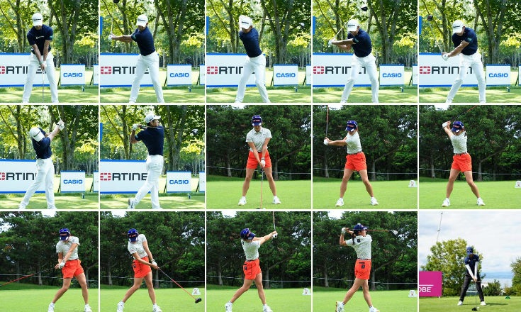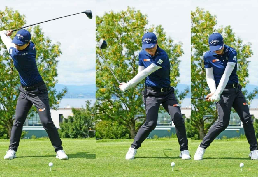 인사이드 느낌으로 샤프트를 세워 테이크백하고, 탑이 작음. 요컨대 도움닫기 거리가 짧은 스윙. 반격 이후에는 리스트콕을 풀면서 오른발에 약간 체중을 남기면서 임팩트로 향합니다만, 이것은 탑이 작기 때문에 몸이 빨리 돌아가기 쉽고, 뒤떨림 방지일 것입니다.