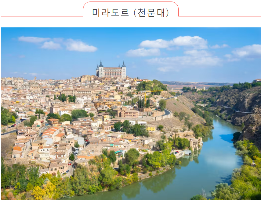 고대 도시 톨레도는 "스페인에 하루만 머무른다면 주저하지 말고 톨레도에 가라"는 속담이 있을 정도로 사람들을 매료시킵니다. 강으로 둘러싸인 언덕에 펼쳐진 아름다운 구시가지는 과거의 화려한 문화를 떠올리게 합니다.