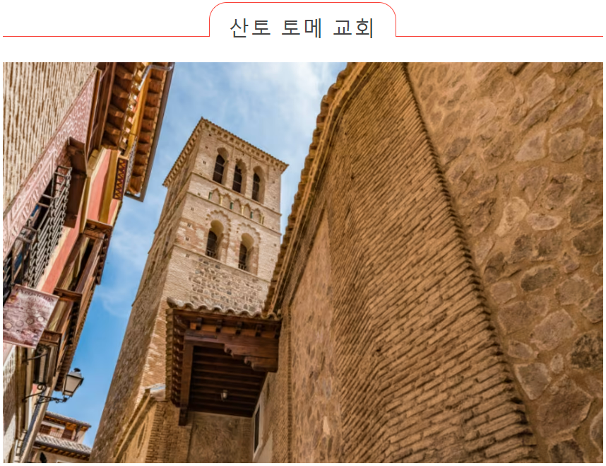 산토 토메 교회는 알폰소 6세 왕이 세운 기독교 교회입니다. 비록 작은 건물이지만, 장식용 창문과 타일이 박힌 모짜라비 탑은 톨레도의 중요한 문화재입니다. 이곳을 사랑한 화가 엘 그레코의 대표작이라고 불리는 '오르가스 백작의 무덤'도 볼 수 있습니다.