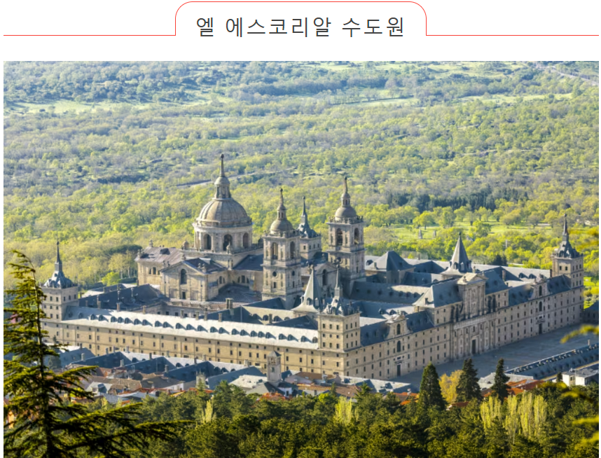 마드리드 외곽의 엘 에스코리알 수도원. 이것은 수도원뿐만 아니라 궁전, 대학, 도서관 등을 포함하는 거대한 단지입니다. 1984년에는 이 시설 주변이 세계문화유산으로 등록되었습니다. 그 중에서도 수만 권의 책을 소장하고 있는 도서관은 마치 영화의 한 장면처럼 정밀한 성화와 오래된 책이 조화롭게 조화를 이루고 있습니다.