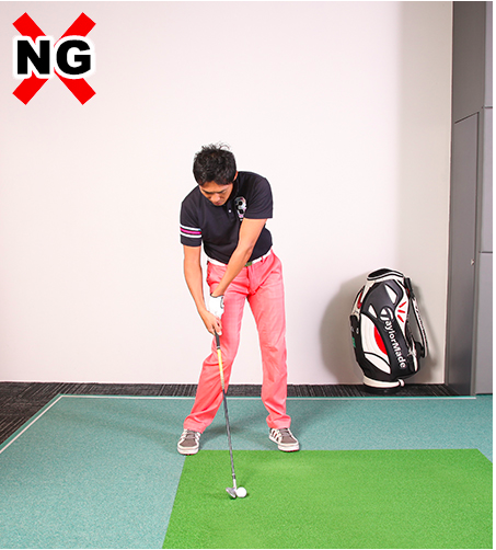 아이언은, 조금만 핸드 퍼스트(손잡이측이 헤드보다 목표 방향으로 기울어져 있는 상태)에 맞히면, 가장 안정됩니다. 어드레스로 공을 스탠스의 중앙 부근에 두고 손을 왼쪽 허벅지 부근에 세팅하면 약간 핸드 퍼스트 자세가 되며, 임팩트에서도 이때 샤프트의 기울기를 재현하는 것이 이상적입니다.