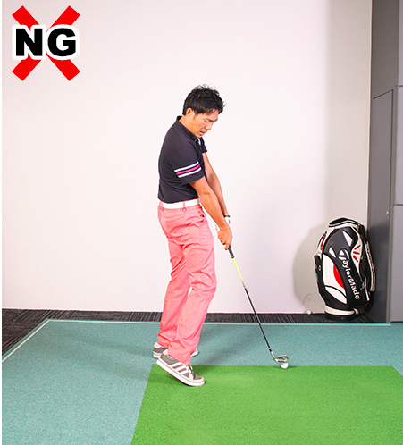 다운 스윙으로 이 움직임이 들어가면 허리의 위치가 앞으로 어긋나며 상체의 각도도 일어나 버립니다. 그로 인해 클럽이 본래 디자인되어 있는 것보다 업라이트(수직)한 각도로 임팩트를 맞이하기(클럽의 힐측이 지면으로부터 떠오르기) 때문에 잘 맞지 않게 됩니다.