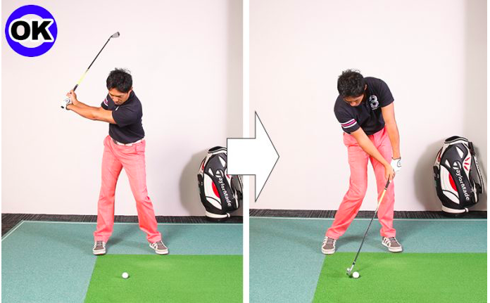 올바른 다운 블로우에서는 상체의 각도를 바꾸지 않고 하체와 몸의 회전에 의해 클럽을 끌어내리는 것으로 손목의 반점이 아슬아슬하게 유지되어 핸드 퍼스트의 임팩트가 됩니다. 상체를 일어나지 않고 몸의 회전으로 내리기 때문에 손길은 낮은 위치로 내려옵니다.손이 떠오르게 되는 것은 손을 사용하여 스스로 헤드를 아래로 흔들려고 한다는 증거입니다.