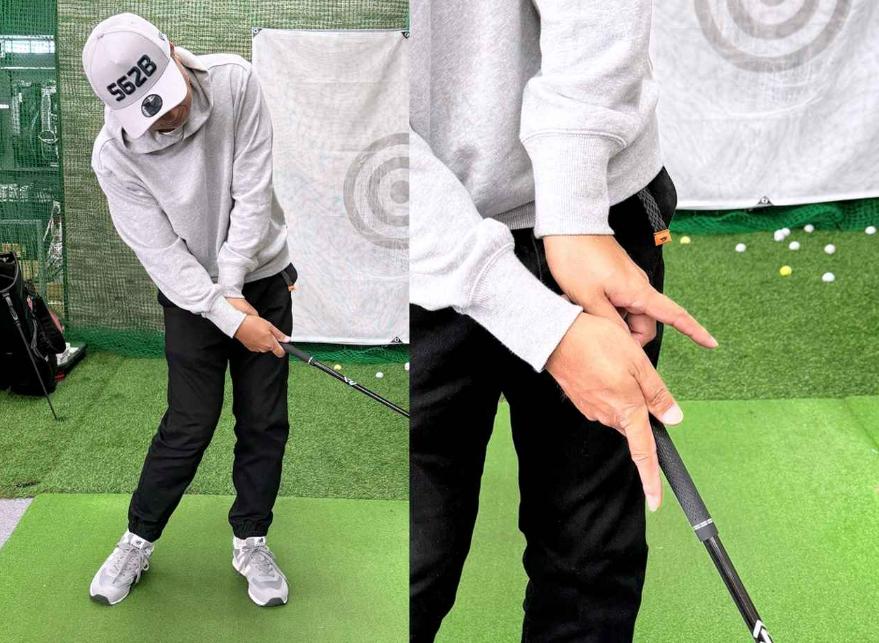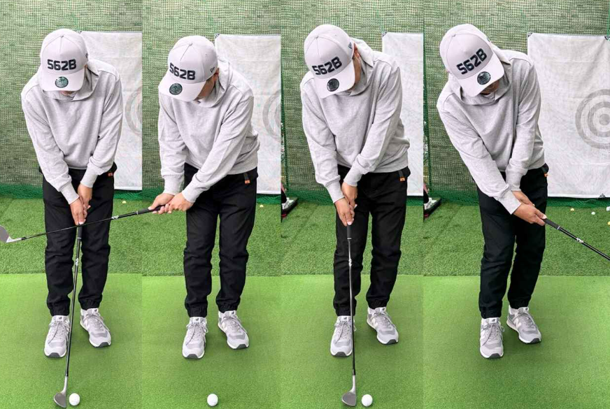 실제로 해보시면, 예상보다 계속 몸을 회전하지 않으면 안 된다는 것에 놀라실수 있습니다^^ 핸드 퍼스트인 채 임팩트를 맞이하여 임팩트 후에도 몸이 타겟 방향을 향할 때까지 돌지 않으면 샤프트가 허리에 닿습니다.