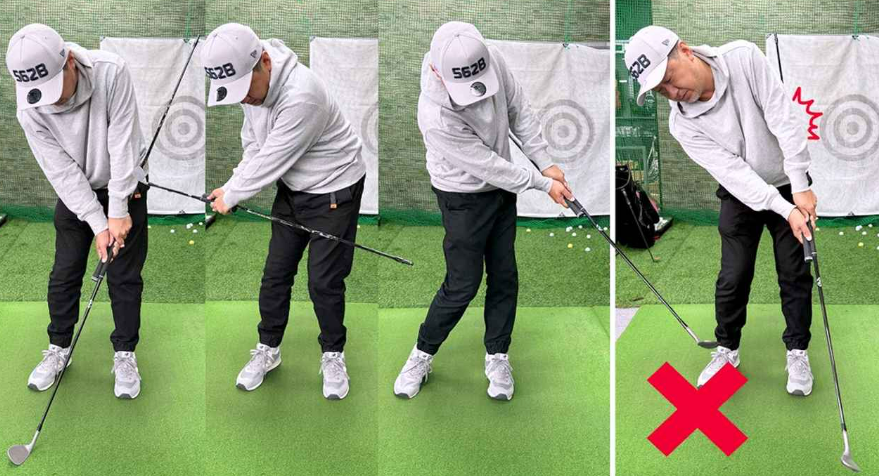 어프로치가 잘못된 원인은 몸의 회전이 멈춰 있는 것이라고 합니다.지면에 있는 공을 "올리자"는 의식이 작용하기 때문에 다운 스윙 후반에 손목을 사용해 버려, 몸의 회전이 멈추고 릴리스가 빨라집니다.