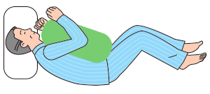 어깨 관절은 몸의 안쪽을 향하는 것이 편해지기 때문에 옆으로 누워 자는 것도 대처법 중 하나입니다. 옆으로 누울 때는 어깨가 눌리지 않도록높이를 유지하기 위한 안는 베개나 둥글게 만든 담요 등을 사용하는 것이 좋습니다.