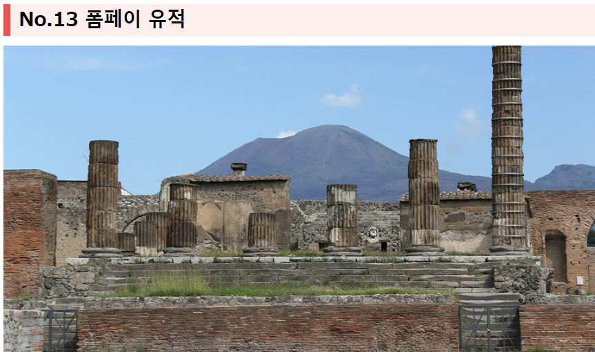 나폴리 근교의 폼페이 유적은 고대 로마를 대표하는 고고학 유적지로 세계문화유산으로 등록되어 있습니다. 이 도시는 화산 폭발로 인한 화쇄류로 하룻밤 사이에 사라졌다고 합니다. 도시 전체가 순식간에 화산재에 잠겼고, 건물과 예술품, 심지어 벽화까지 매우 양호한 상태로 남았습니다. 15유로의 입장료로 유적지를 방문할 수 있습니다.