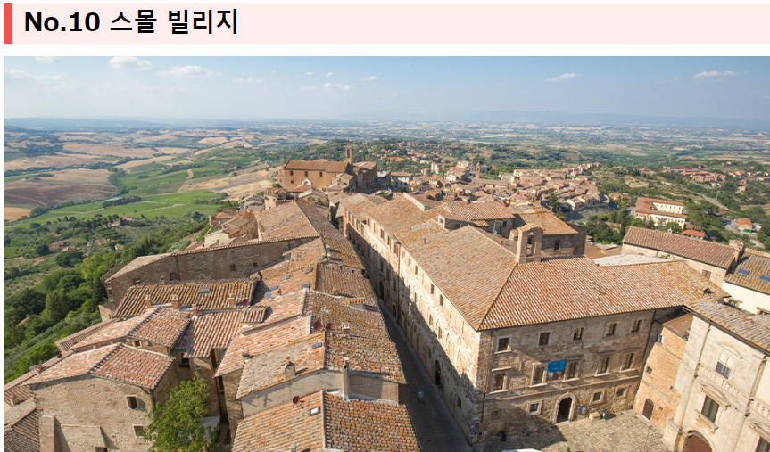 이탈리아는 도시뿐만 아니라 작은 마을로도 매력적입니다. 토스카나의 산악 마을에서는 농가에 머물면서 현지 요리와 와인을 즐길 수 있는 "아그리투리스모"가 번성합니다. 이탈리아 남부에 위치한 "로코로톤도"의 거리는 고추 한 송이 없이 깨끗이 청소되었으며 잘 손질된 꽃으로 가득합니다. 리구리아의 북서부 지역에 있는 "브루그나토"에는 소셜 미디어에서 잘 어울리는 화려한 집들이 늘어서 있습니다. 토스카나의 산 지미냐노는 피렌체나 시에나에서 당일치기 여행으로 방문할 수 있는 아름다운 벽으로 둘러싸인 마을입니다.
