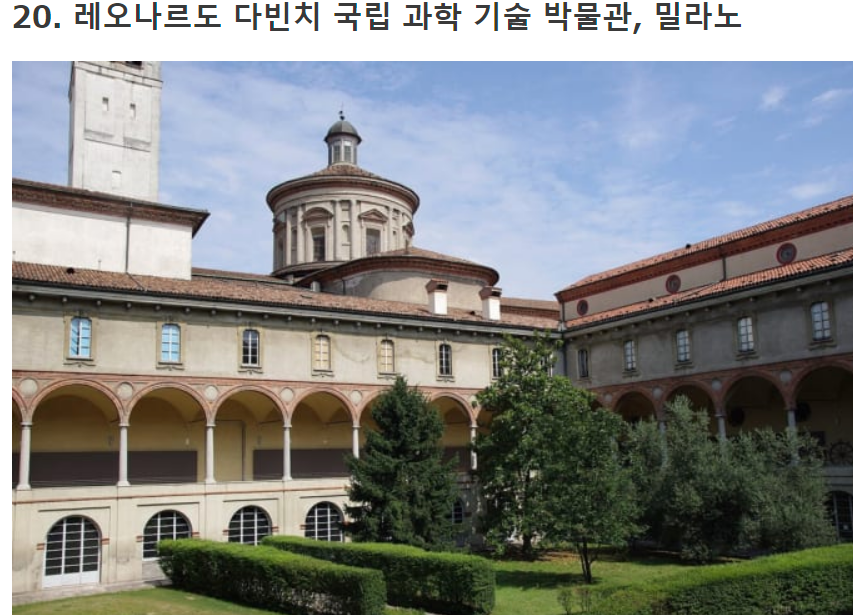 이탈리아의 거장 레오나르도 다빈치의 이름을 딴 레오나르도 다빈치 기념 국립 과학 기술 박물관은 다빈치 탄생 500주년을 기념하기 위해 만들어졌습니다. 이 건물은 16 세기 초에 지어진 수도원으로 고풍스러운 분위기가 특징 인 관광 명소입니다.