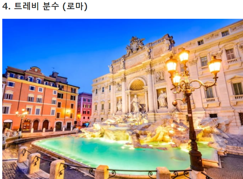 트레비 분수는 이탈리아 로마에서 가장 큰 바로크 양식의 분수라고 합니다. 미국의 인기 로맨틱 코미디 드라마 '트레비 분수에서의 두 번째 사랑'의 배경이기도 합니다.
