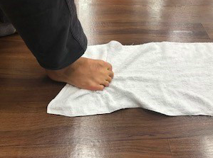 바닥에 수건을 깔고 그 위에 발을 두고 발가락으로 잡듯이 하여 수건을 끌어당깁니다.