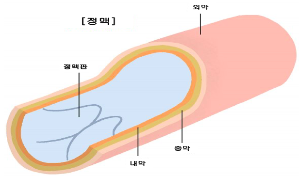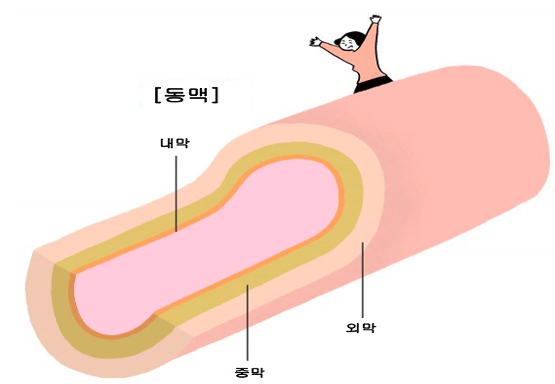 동맥은 외막, 중막(평활근), 내막(내피세포)의 삼층 구조로 심장 박동으로 혈액이 흐르고 있습니다. 동맥 벽은 혈압에 견딜 수 있도록 두껍고 탄력이있어 압력이 내려가는 순간에도 원기둥 모양을 유지할 수 있습니다.내막 안쪽에 상처가 생겨 혈소판 등이 모여 굳어지는 것이 동맥경화.