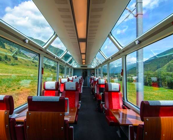 You can enjoy a superb view from the panoramic window extending up to the ceiling, and it is a railway registered as a World Heritage Site.The Alps, glaciers, and beautiful lakes are just around the corner, and you can enjoy flowers and various views.