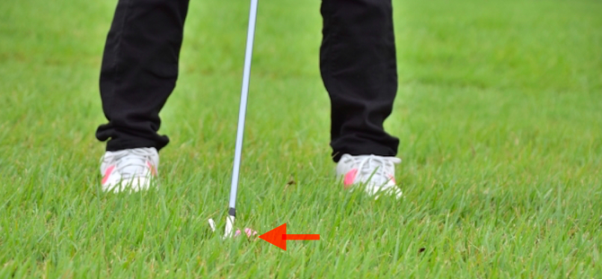 저항을 줄이기 위해 일반 위치보다 약간 오른발 쪽으로 합니다. 오른발 쪽으로 하면 아이언이 날카로운 각으로 내려오기 때문에 저항의 양을 줄일 수 있습니다.