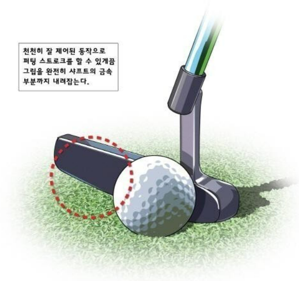 그립을 내려잡아 아래쪽 손의 엄지가 거의 샤프트의 금속 부분에 닿을 정도가 되도록 합니다. 이는 퍼터 제어력을 높여 스트로크 속도를 낮추고 좀 더 부드럽게 볼을 굴리는 데 도움이 됩니다. 스트로크를 갑자기 가속시키는 일은 절대로 피해야 합니다.