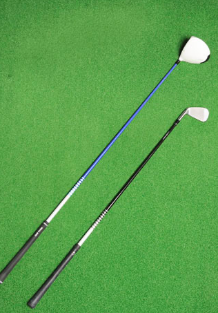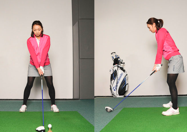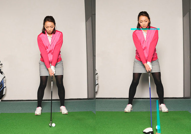 자세의 기본은 변하지 않고, 앞으로 기울인 자세의 폼으로 손을 바로 아래로 내린 위치에 그립이 오게 됩니다만, 샤프트 길이만큼 공의 위치가 멀어져 있는 것을 알 수 있으리라 생각합니다.