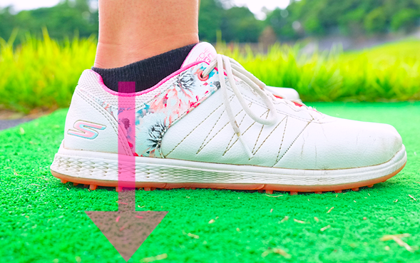 또 다른 대책법은 인사이드 아웃과는 반대되는 아웃사이드 인 움직임을 의식하는 것. 시동시에 순간 오른쪽 발 뒤꿈치에 체중을 실어 발을 디디는 의식을 가집니다. 몸의 중심이 자연스럽게 아웃부터 들어가게 됩니다.