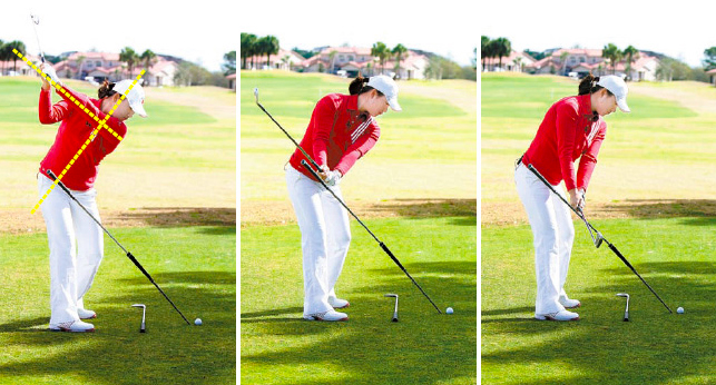 자연스런 정지 지점을 넘어가면 양팔이 위로 들리고 체중이 왼발로 이동된다. 바로 슬라이스 동작이다. 양팔의 팔꿈치 부분이 구부러지고 있다면 이 또한 백스윙을 너무 멀리 가져간 것이다.