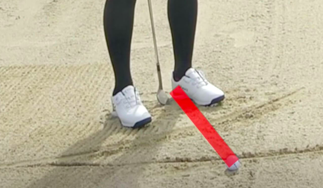 보통과 다름 없는 테이크 백을 하면 다리의 라인에 대해서 쳐집니다. 여기서 30도 방향으로 치면서 모래를 얇게 깎아 내는 것이 가능해 집니다.