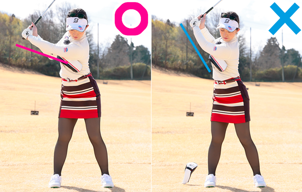 백스윙에서 오른쪽 겨드랑이가 열리면 톱에서 샤프트가 크로스되어 극단적인 인사이드 궤도가 되어 버립니다. 커버가 떨어지지 않도록 탑의 높이를 억제함으로써 반격 이후에 올바른 플레인 그대로 상체의 회전으로 흔드는 것으로 연결됩니다.