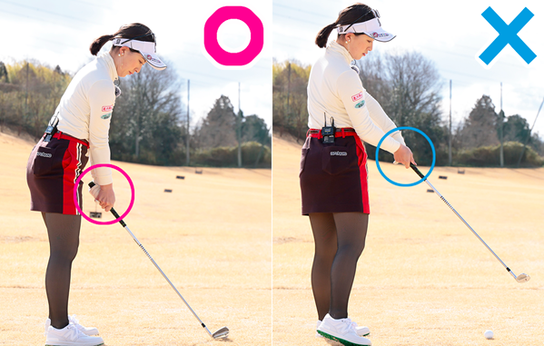 양쪽 겨드랑이를 조이기 위해 겨드랑이에만 집중하는 것이 꽤 어려운 것입니다. 의식하는 포인트는 임팩트 전후의 손 위치. 손을 벨트 가까이로 통과시킴으로써 자연스럽게 양쪽 겨드랑이가 조여져 재현성이 높은 컴팩트한 스윙을 몸에 익힙니다.